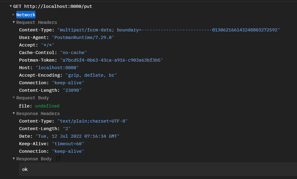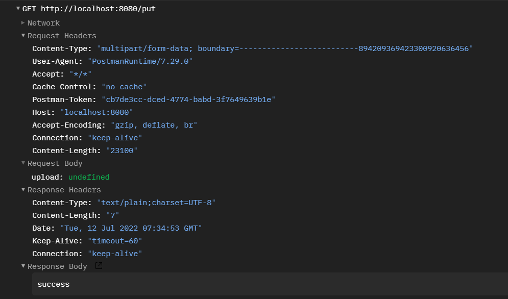 @RequestMapping(value = "/put") public String put(@RequestParam("file")MultipartFile file, RedirectAttributes redirectAttributes){ if (file.isEmpty()){ redirectAttributes.addFlashAttribute("message","请选择文件"); return "no"; } try { byte[] bytes = file.getBytes(); Path path = Paths.get("./"+file.getOriginalFilename()); Files.write(path, bytes); redirectAttributes.addFlashAttribute("message","成功上传"+file.getOriginalFilename()); } catch (Throwable e) { e.printStackTrace(); } return "ok"; }