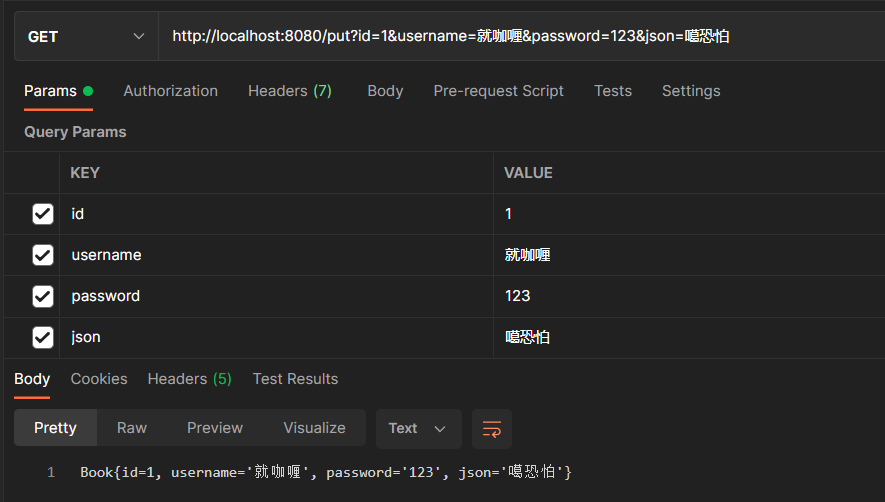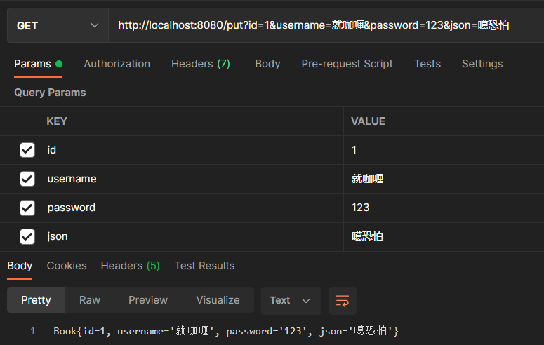 @RequestMapping(value = "/put") public String put(Book book){ return book.toString(); }