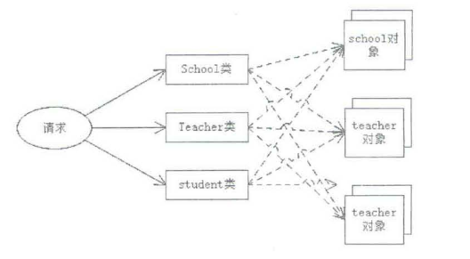 在传统编程方式中,要实现某种功能一般都需要几个对象相互作用。在主对象中要保存其他类型对象的引用,以便在主对象中实例化对象,然后通过调用这些引用的方法来完成任务,其运行方式如图