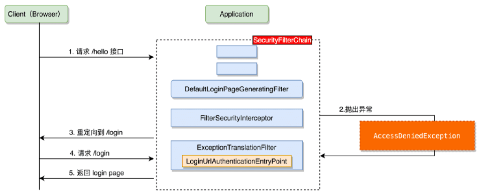 客户端(浏览器)发起请求去访问/hello接口,这个接口默认是需要认证之后才能访问的。 这个请求会走一遍Spring Security中的过滤器链,在最后的FilterSecurityInterceptor 过滤器中被拦截下来,因为系统发现用户未认证。请求拦截下来之后,接下来会抛出 AccessDeniedException 异常。 抛出的 AccessDeniedException 异常在 ExceptionTranslationFilter 过滤器中被捕获, ExceptionTranslationFilter 过滤器通过调用 LoginUrlAuthenticationEntiyPoint#commence 方法给客户端返回302,要求客户端重定向到/login页面。 客户端发送/login请求。 /login请求被DefaultLoginPageGeneratingFilter过滤器拦截下来,并在该过滤器中返 回登录页面。所以当用户访问/hello接口时会首先看到登录页面。 在整个过程中,相当于客户端一共发送了两个请求,第一个请求是/hello,服务端收到之 后,返回302,要求客户端重定向到/login,于是客户端又发送了/login请求。现在去理解上面这一个流程图可能还有些困难,等学完后面的内容之后,再回过头来看这个流程图,应该就会比较清晰了。