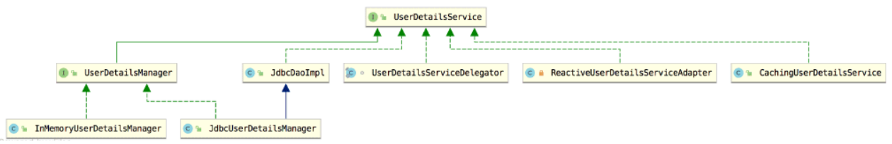在实际项目中,一般需要开发者自定义UserDetailsService的实现。如果开发者没有自定义 UserDetailsService 的实现,Spring Security 也为 UserDetailsService 提供了默认实现,如下图