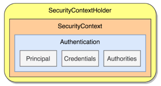 1.1.1 SecurityContextHolder SecurityContextHolder 中存储的是 SecurityContext,SecurityContext 中存储的则是 Authentication,三者的关系如图2-13所示。