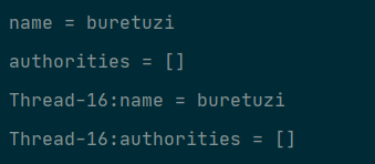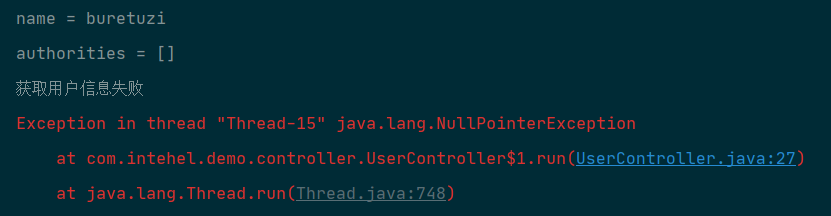 package com.intehel.demo.controller;import org.springframework.security.core.Authentication;import org.springframework.security.core.GrantedAuthority;import org.springframework.security.core.context.SecurityContextHolder;import org.springframework.web.bind.annotation.GetMapping;import org.springframework.web.bind.annotation.RestController;import java.util.Collection;@RestController public class UserController { @GetMapping("/user") public void userinfo () { Authentication authentication = SecurityContextHolder.getContext().getAuthentication(); String name = authentication.getName(); Collection<? extends GrantedAuthority > authorities = authentication.getAuthorities(); System.out.println("name = " +name); System.out.println("authorities = " +authorities); new Thread (new Runnable () { @Override public void run () { Authentication authentication = SecurityContextHolder.getContext().getAuthentication(); if (authentication == null ) { System.out.println("获取用户信息失败" ); } String name = authentication.getName(); Collection<? extends GrantedAuthority > authorities = authentication.getAuthorities(); String threadName = Thread.currentThread().getName(); System.out.println(threadName+":name = " +name); System.out.println(threadName+":authorities = " + authorities); } }).start(); } }