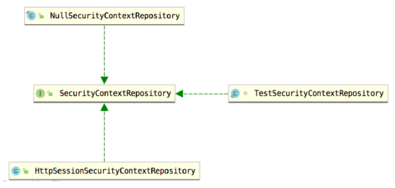 图 2-19 在这三个实现类中,TestSecurityContextRepository为单元测试提供支持;NullSecurityContextRepository 实现类中,loadContext 方法总是返回一个空的 SecurityContext 对象, saveContext方法未做任何实现,containsContext方法总是返回false ,所以 NullSecurityContextRepository 实现类实际上未做 SecurityContext 的存储工作,