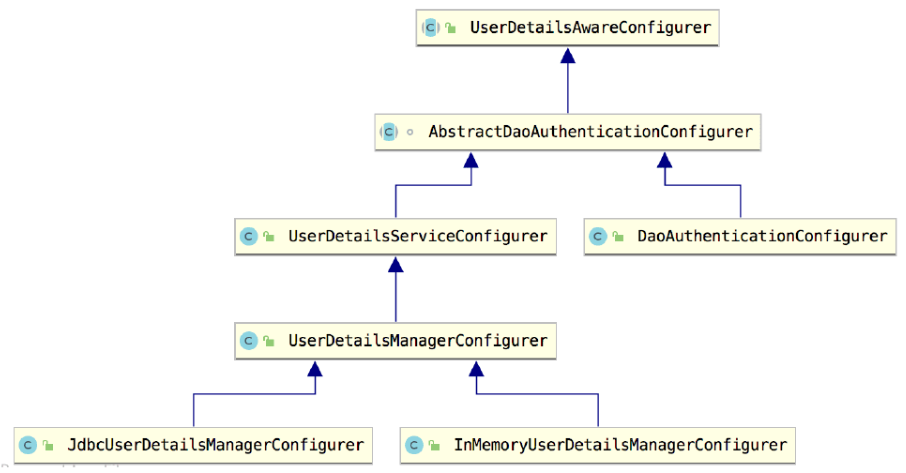 图 4-5 AbstractDaoAuthenticationConfigurer: 完成时 DaoAuthenticationProvider 的配置。 UserDetailsServiceConfigurer:完成对 UserDetailsService 的配置。 UserDetailsManagerConfigurer :使用 UserDetailsManager 构建用户 对象,完成对 AuthenticationManagerBuilder 的填充。 JdbcUserDetailsManagerConfigurer:配置 JdbcUserDetailsManager 并填充到 AuthenticationManagerBuilder InMemoryUserDetailsManagerConfigurer:配置 InMemoryUserDetailsManager。 DaoAuthenticationConfigurer: 完成对 DaoAuthenticationProvider 的配置。 AbstracthttpsConfigurer: