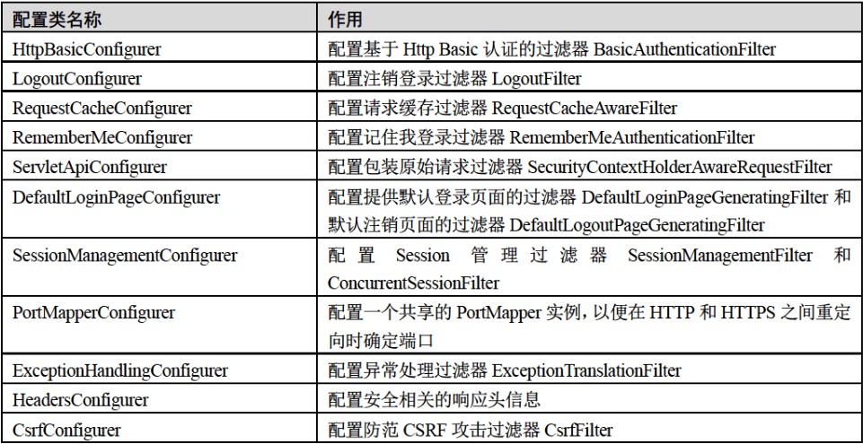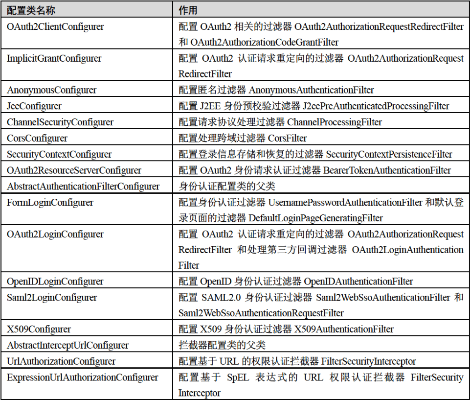 AbstracthttpsConfigurer的实现类比较多,基本上都用来配置务种各样的过滤器,参见表 4-1。