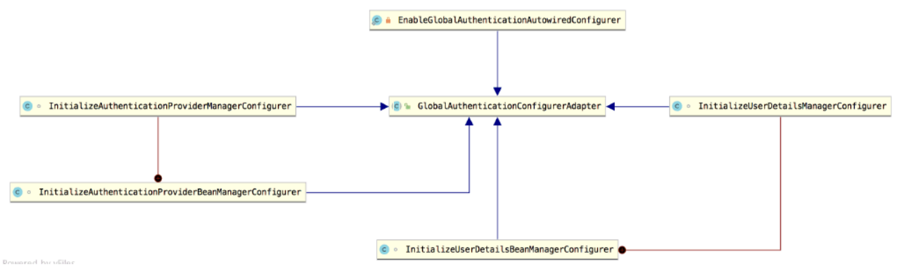 GlobalAuthenticationConfigurerAdapter 主要用于配置全局 AuthenticationManagerBuilder, 在 AuthenticationConfiguration 类中会自动使用 GlobalAuthenticationConfigurerAdapter 提供的 Bean 来配置全局 AuthenticationManagerBuilder。