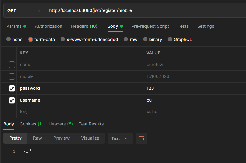 @RestController @RequestMapping("/jwt") public class JwtUserController { @Autowired private UserRepository userRepository; @Autowired private UserRoleRepository userRoleRepository; @RequestMapping(value = "/register/mobile") public String register(User user){ try { User userName = userRepository.findUserByUsername(user.getUsername()); if (userName != null){ return "用户名已存在"; } BCryptPasswordEncoder encoder = new BCryptPasswordEncoder(); user.setPassword("{bcrypt}"+encoder.encode(user.getPassword())); List<Role> roles = new ArrayList<>(); Role role = userRoleRepository.findByName("ROLE_admin"); roles.add(role); user.setRoles(roles); userRepository.save(user); }catch (Exception e){ return "出现了异常"; } return "成果"; } }
